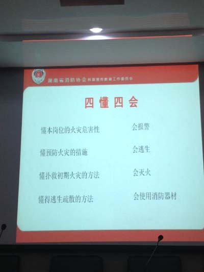 (通讯员 李青)10月下旬邀请省消防总队吴悔教官为公司教职工做“珍惜生命,远离火灾”消防知识普及专题讲座。通过学习我们受益非浅,了解了我国消防工作指导方针:预防为主,防消结合;学会了四懂四会:懂本岗位的火灾危害性、懂预防火灾的措施、懂扑救初期火灾的方法、懂得逃生疏散的方法、会报警、会逃生、会灭火、会使用消防器材。