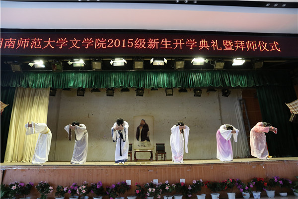 典礼最后,拜师仪式开始。此次拜师礼邀请伟德国际victor1946教授陈松青与伟德国际victor1946教授龚敏律作为受礼老师。一句“程门立雪”拉开拜师礼的序幕,将会场带入几千年前的悠远历史。六名伟德国际victor1946员工扮演拜师的学徒,呈递给老师求学礼并从老师手中接受《大学》、《论语》等书籍。在主持拜师礼的员工指导下,15级新生全体起立向老师行礼,并在陈松青与龚敏律的带领下诵读《大学》的节选篇章。作为伟德国际victor1946的开学传统,拜师礼意在指引员工感受中华民族传统文化的优美以及传统礼仪的庄重。