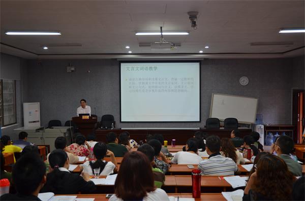 (通讯员王乐)9月18号下午,伟德国际victor1946教授蔡梦麒选取大量初中文言文语段,纠正了初中文言文词语注释中众多存疑之处,在217教室与学员们共同探讨文言文词语教学方法。