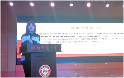 最后,周子杨用毕业时间轴向同学们罗列毕业前不同时期的具体任务。她呼吁大家重视毕业论文撰写,合理规划时间。号召大家踊跃参与12月7日、8日公司将举行的两场大型招聘会。