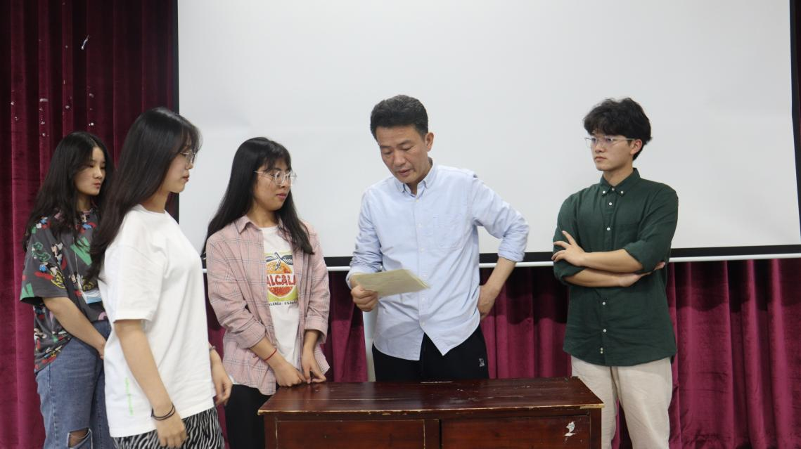 李强老师认真观看两组同学排练话剧《驴得水》的片段,在台词逻辑重音节和舞台调度等方面对同学进行专业指导,提出要深入剧本,了解人物,置身角色来表演,并与同学们反复揣摩剧本台词,感悟话剧魅力。经过指导同学们表演得到了很大进步。