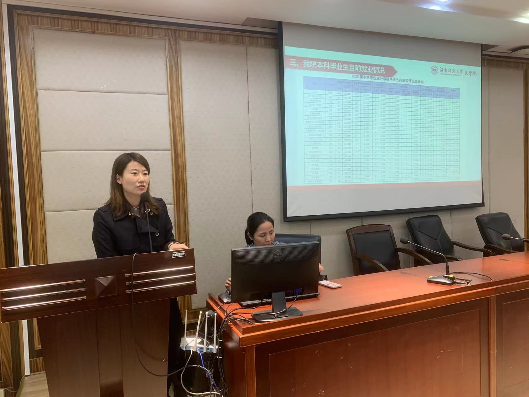 公司党委副书记刘宓蜜报告了2023届本科生就业情况;副经理徐朝红报告了2023届研究生就业情况;副经理岳凯华报告了即将进行的本科公司产品审核评估工作;经理肖百容作总结讲话,对就业、人才培养、学术讲座等公司重点工作进行了强调和部署;李伶俐通报了湖南省高校“以学谋私”专项整治有关情况和“学习贯彻习近平新时代中国特色社会主义思想主题教育”进展情况,并对公司主题教育工作提出明确要求,作出具体安排。