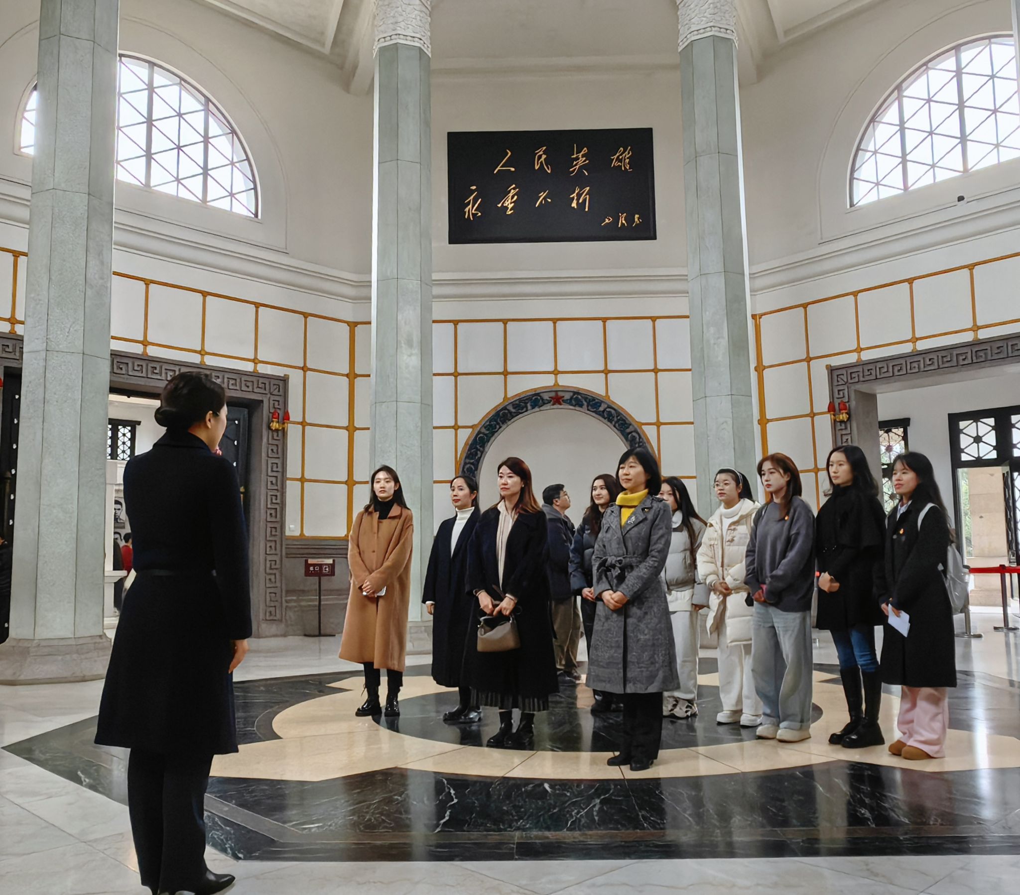 图为参会成员在烈士塔内听讲解