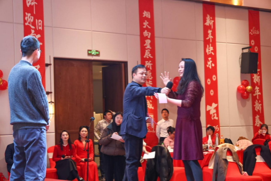 此外,联欢会还穿插了游戏环节,由张德强老师主持。老师们分组竞技,团结协作,共同完成挑战,展现了伟德国际victor1946教职工的默契与团队精神。现场笑声不断,掌声雷动。抽奖环节为老师们送上精美的礼品和美好祝福,给联欢会增添了更多欢乐和惊喜。