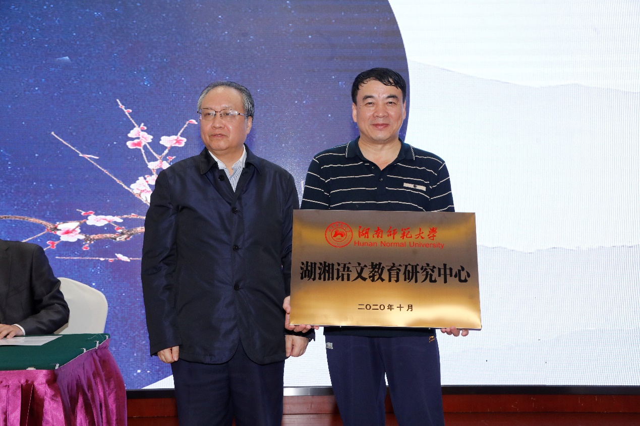 2020年10月,中心举行成立大会暨首届湖湘语文学术论坛,图为伟德国际1946亚洲版欧阳副董事长给中心授牌